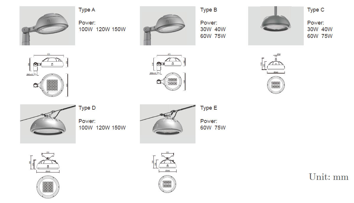 A group of multi-functional street lighting are connected by different brackets to achieve different effects, so as to suit of different area places. It be widely used in courtyards, residential areas, parks, pedestrian streets and other places. The power range is 30W-150W.