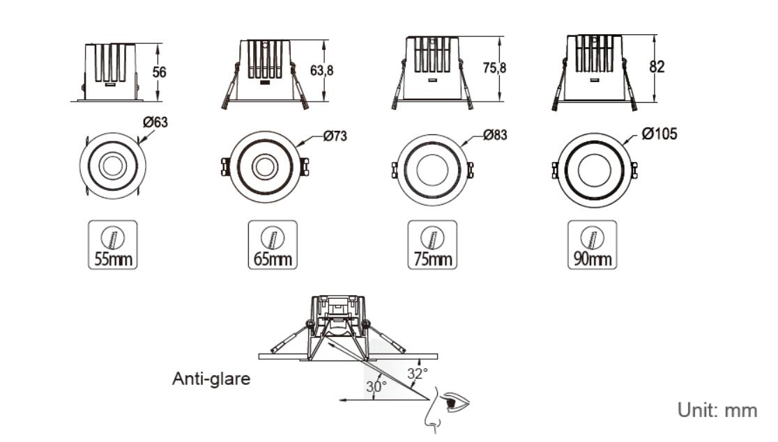 1x9W @ Dia 63 @ Dia 73 @ Dia 83 mm