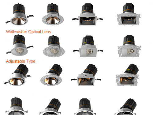 嵌入式筒燈 : 可調角度類型(調角30°和355°旋轉),固定類型,無框邊類型和洗牆燈類型