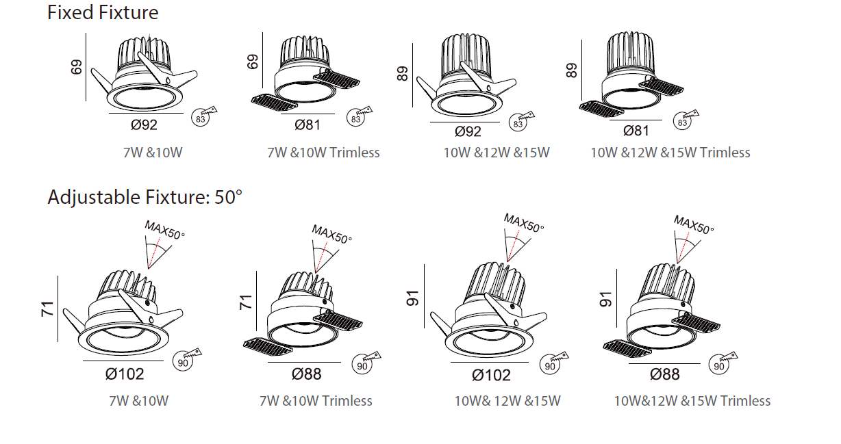 - Dia: 88x H: 91 Cut off: Dia 90 @ 10W & 12W &15W Trimless& Tilt-Angle Type