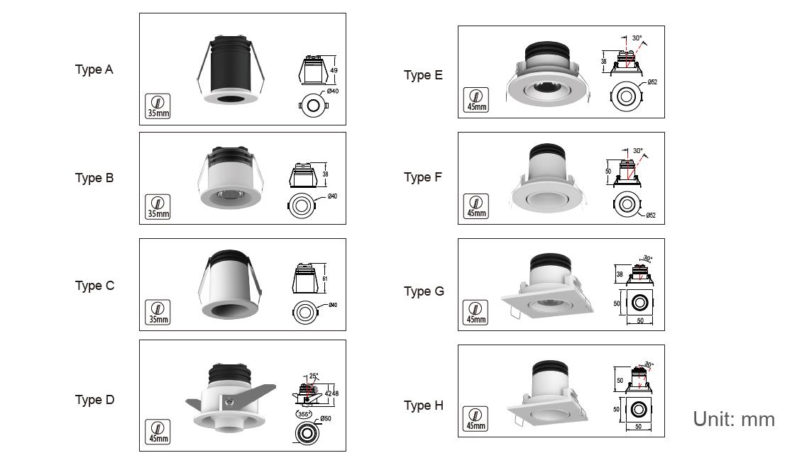 • Dia 35mm @ Dia: 40 x H: 49 mm @ Type A        Dia 35mm @ Dia: 40 x H: 38 mm @ Type B