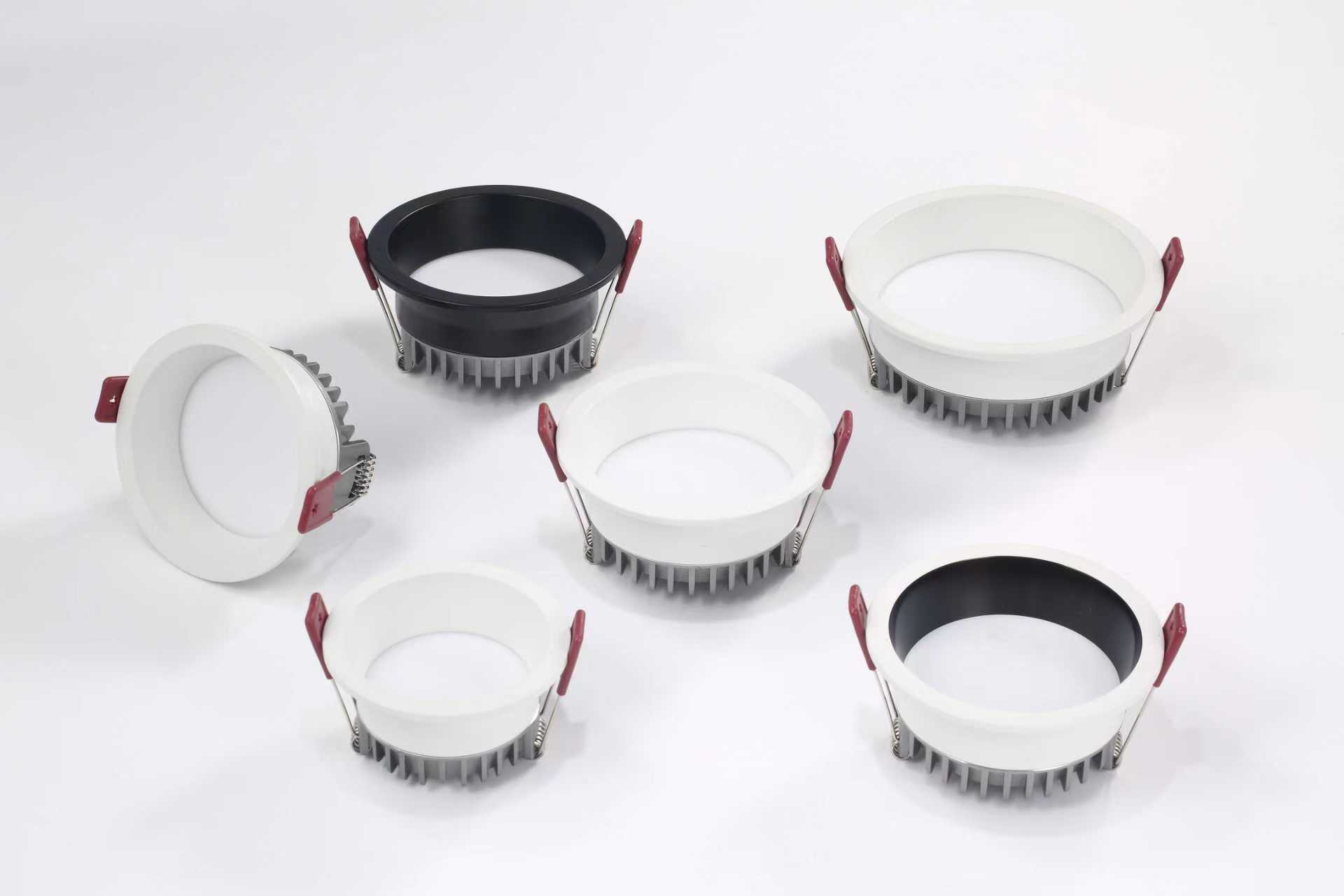 LED RECESSED LOW GLARE DOWN LIGHT. Housing: die-cast aluminium with powder-coated, Anti UV and fire resistance Polycarbonate (PC) diffusor of SMD type and clear tempered glass of COB type, anti-glare reflector to achieve UGR< 19. Materials is complied with Hot Wire Testing: 850°C:  The blue light risk group: (RG0 ) under IEC TR 62778 & IEC 62471  testing. Optional Tunable White controlled by DALI Dimming.