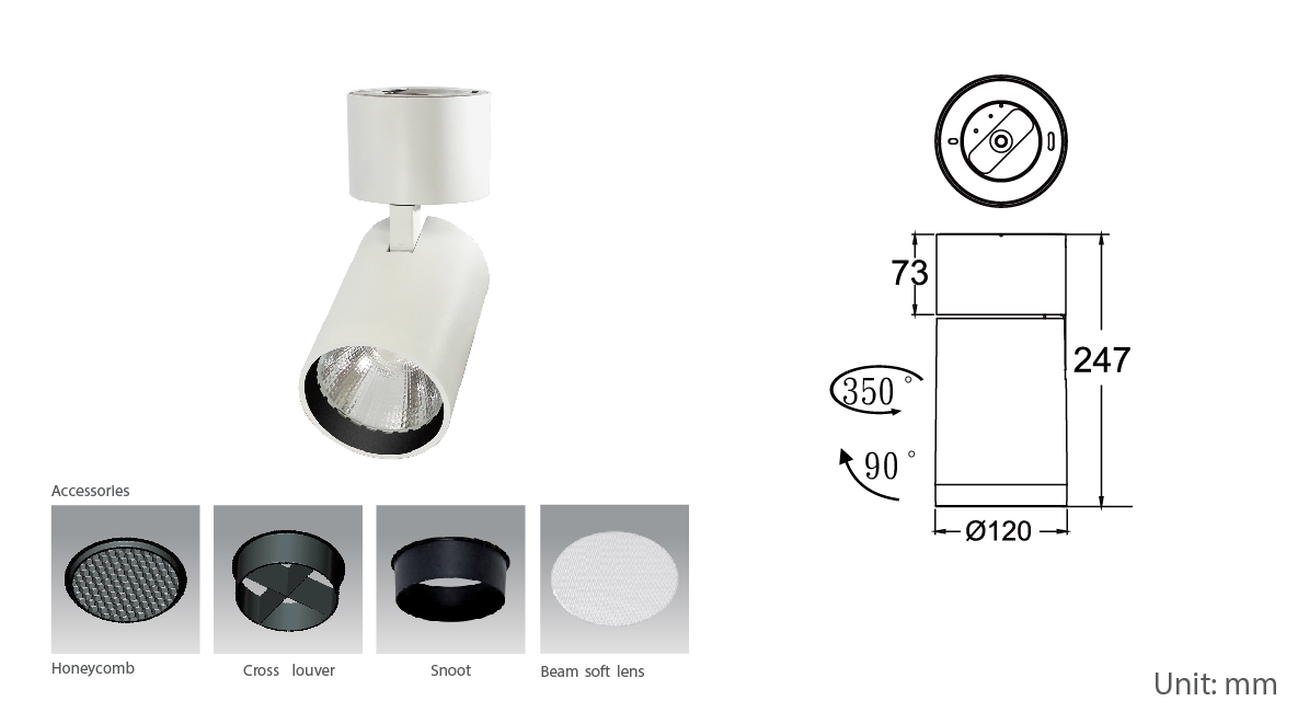 明裝式燈具-可調傾斜角度為0-90°,350°支架旋轉