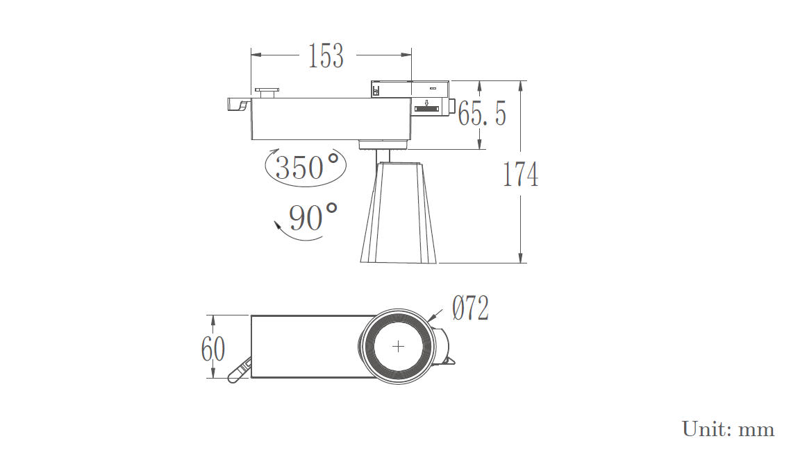 LED track light. Housing: die-cast aluminium, powder-coated, designed as heat sink. and PMMA. optical Lens . UGR <22 Integrated-Type driver. Roated Through 350° and Tilted up to 90°.