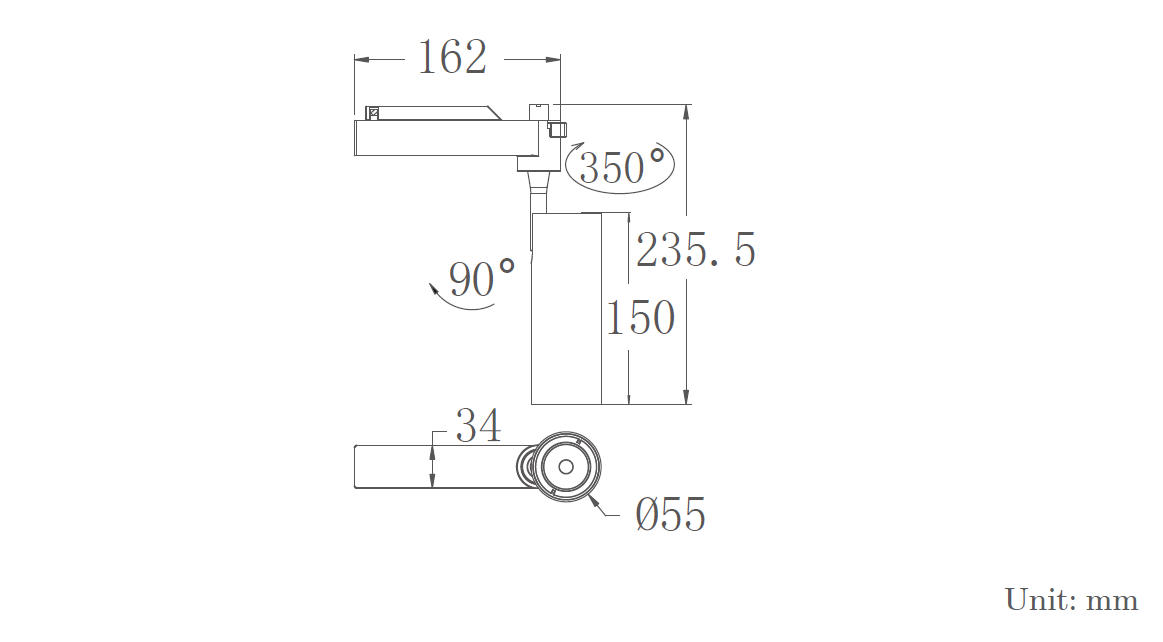 LED track light. Housing: die-cast aluminium, powder-coated, designed as heat sink. and PMMA. optical Lens . UGR <22 Integrated-Type driver. Roated Through 350° and Tilted up to 90°.
