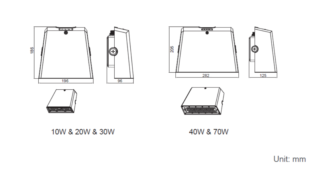 • L: 282 x W: 205 x H: 125 mm Below 70W