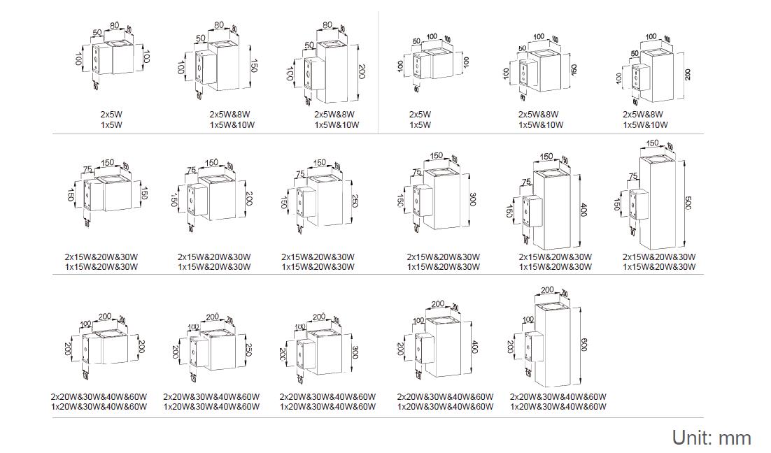 • W: 80 x L: 80 x  H: 100 mm         W: 80 x L: 80 x  H: 150 mm         W: 80 x L: 80 x  H: 200 mm