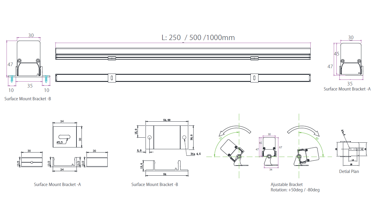 W: 35 x H: 55 x L:250 mm         W: 35 x H: 55 x L:500 mm        W: 35 x H: 55 x L:1000 mm