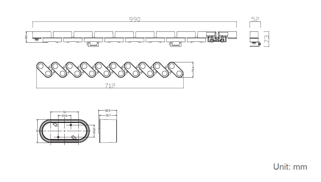 L: 990 x W: 52 x H: 73 mm (With bracket)